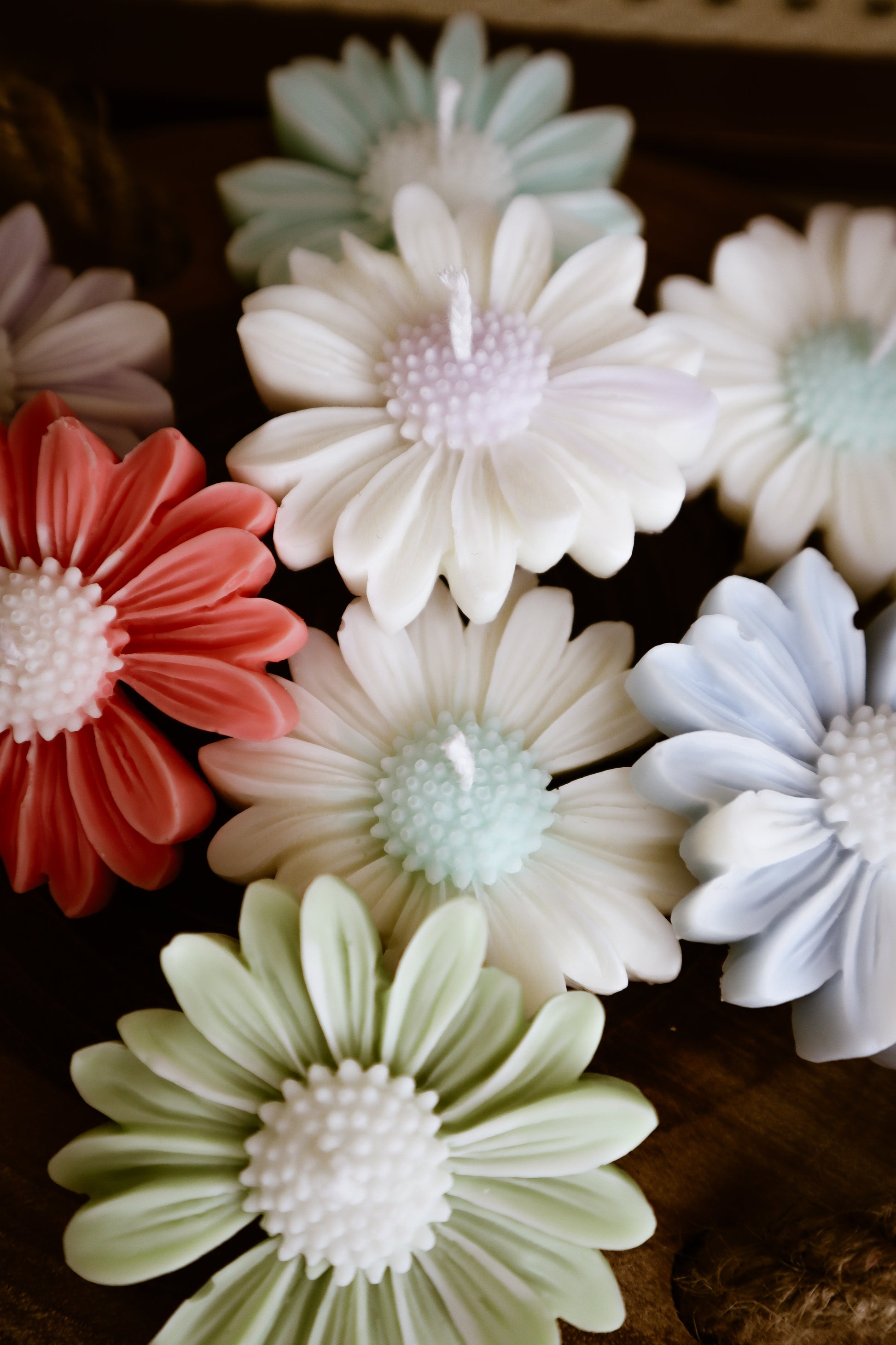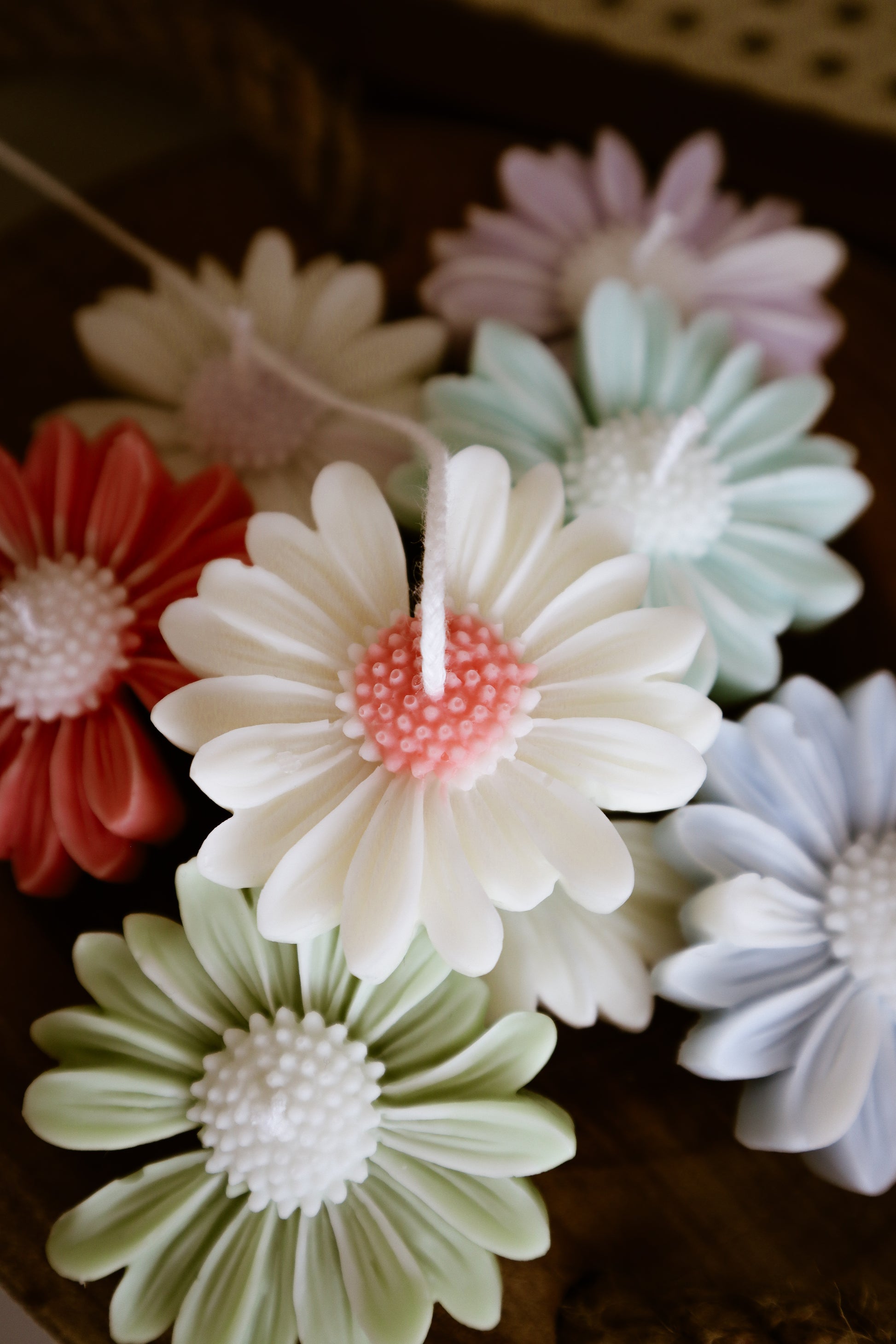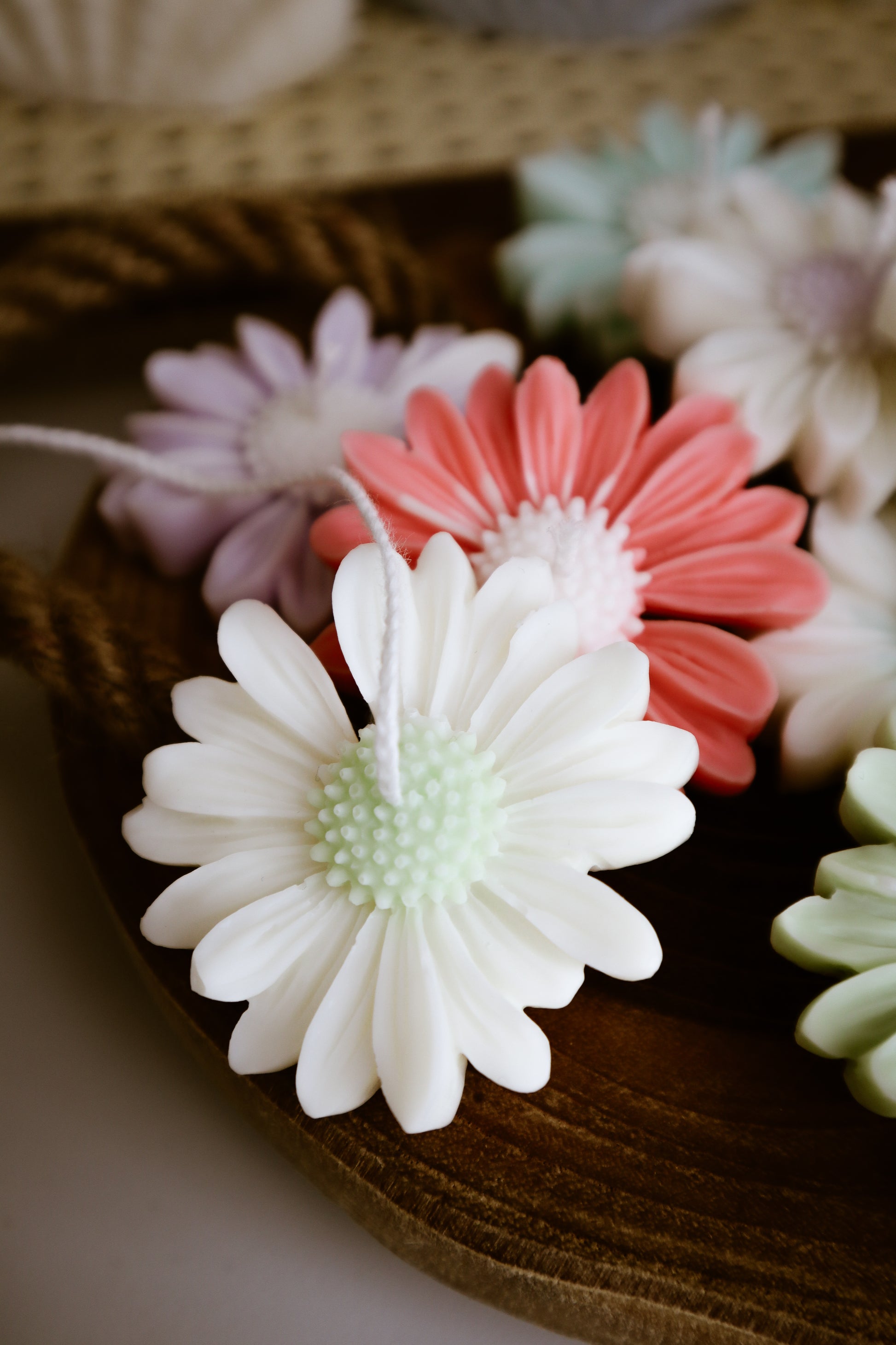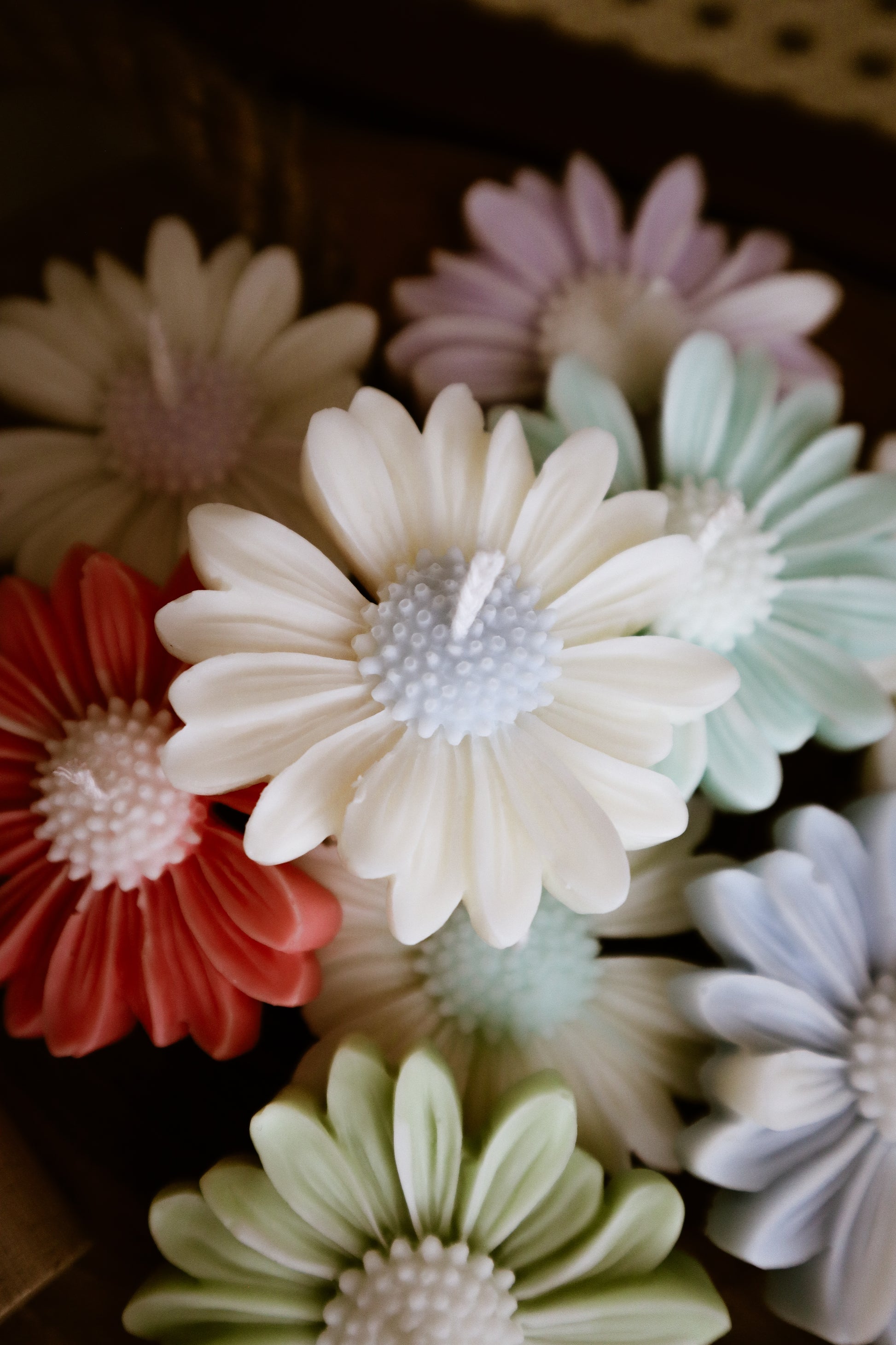 Deze madeliefkaarsjes zijn verkrijgbaar met een wit bloemhart en gekleurde blaadjes of met een gekleurd bloemhart en witte blaadjes.