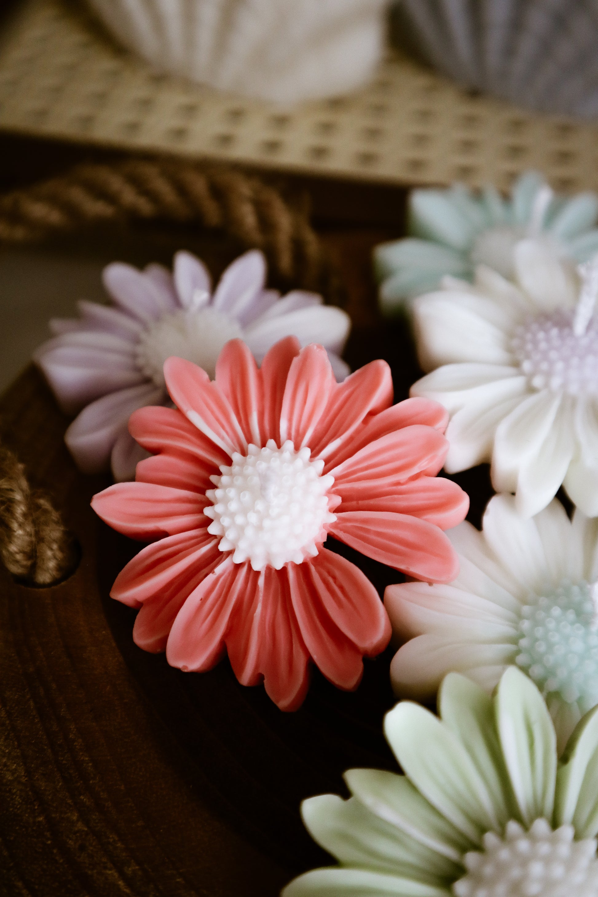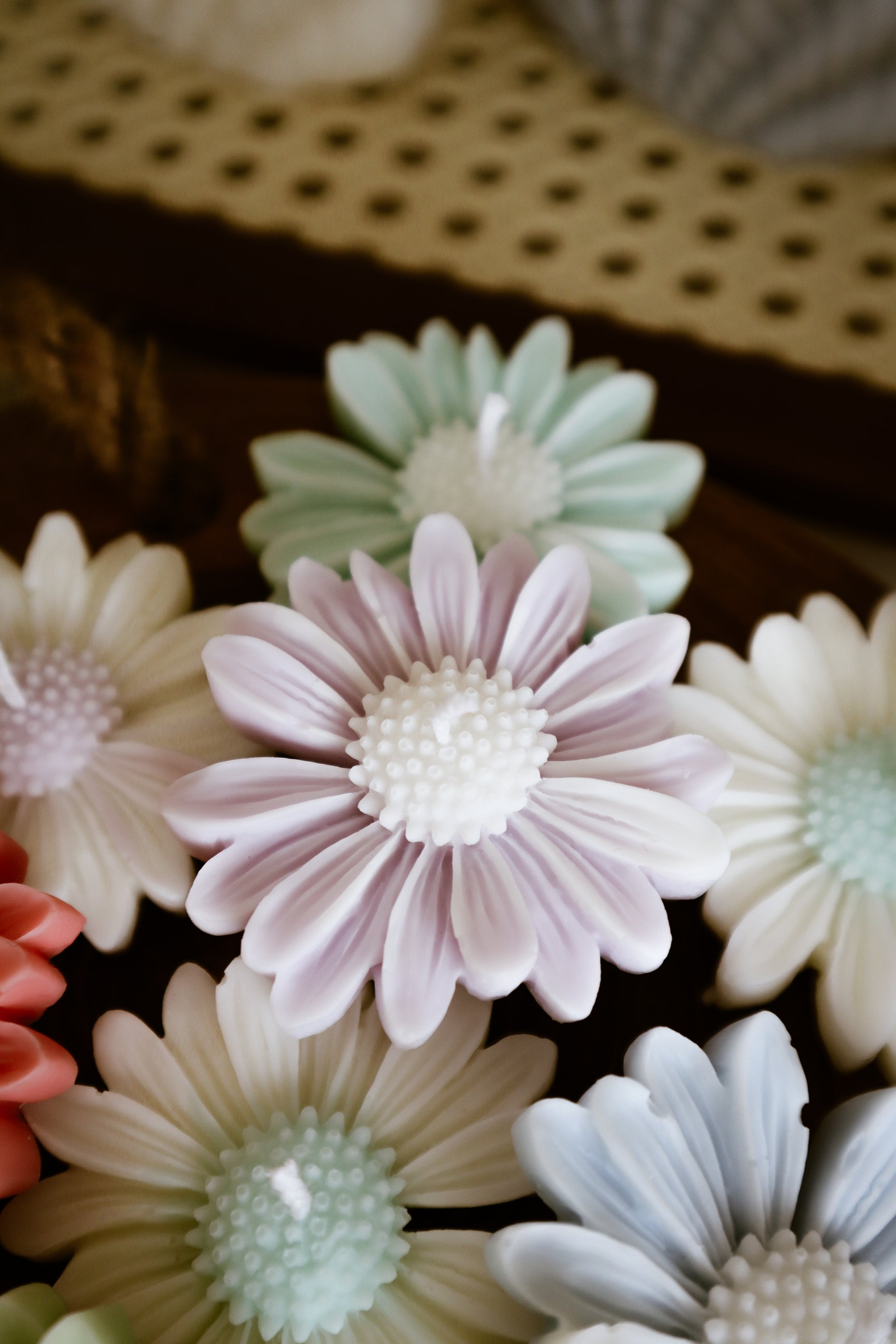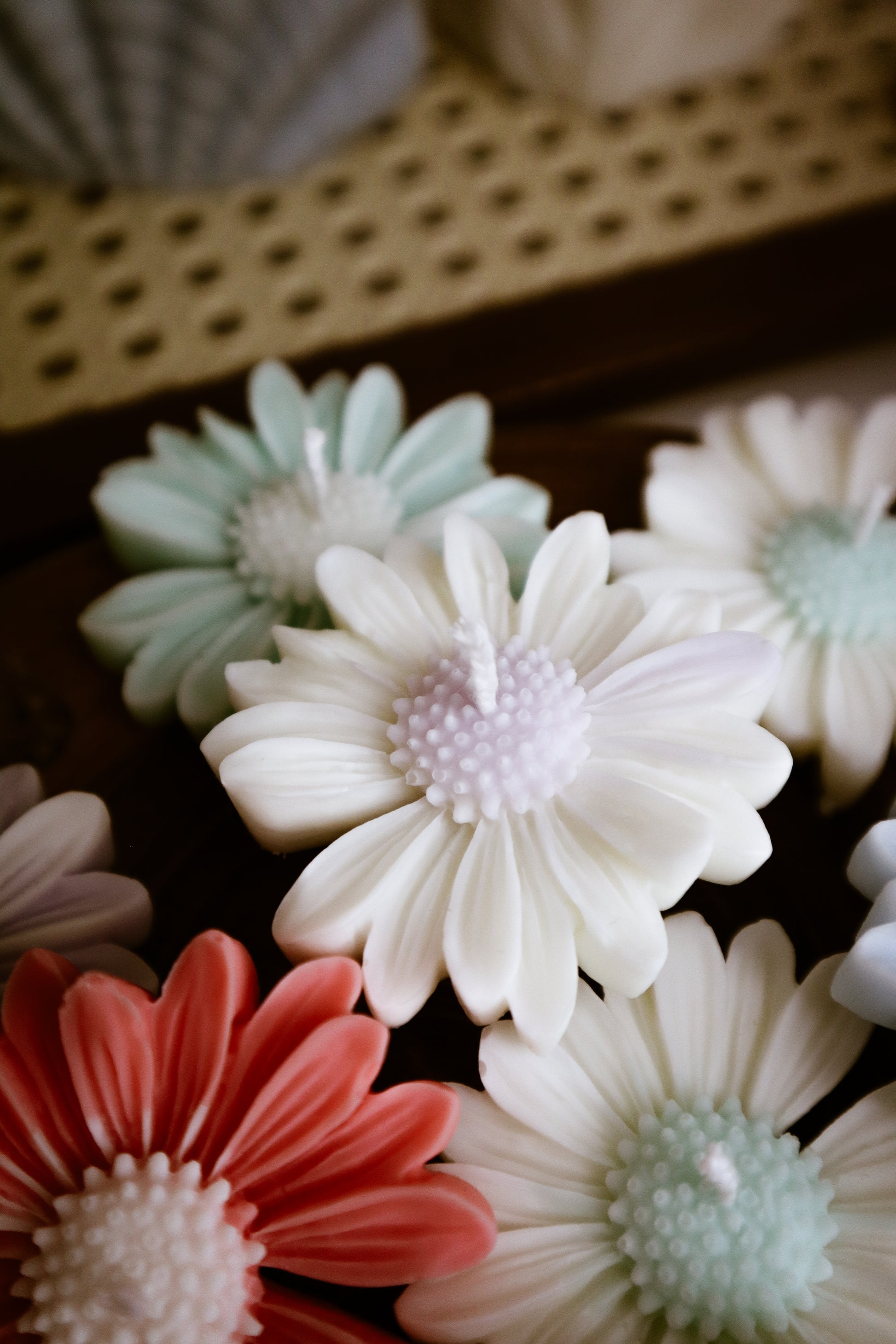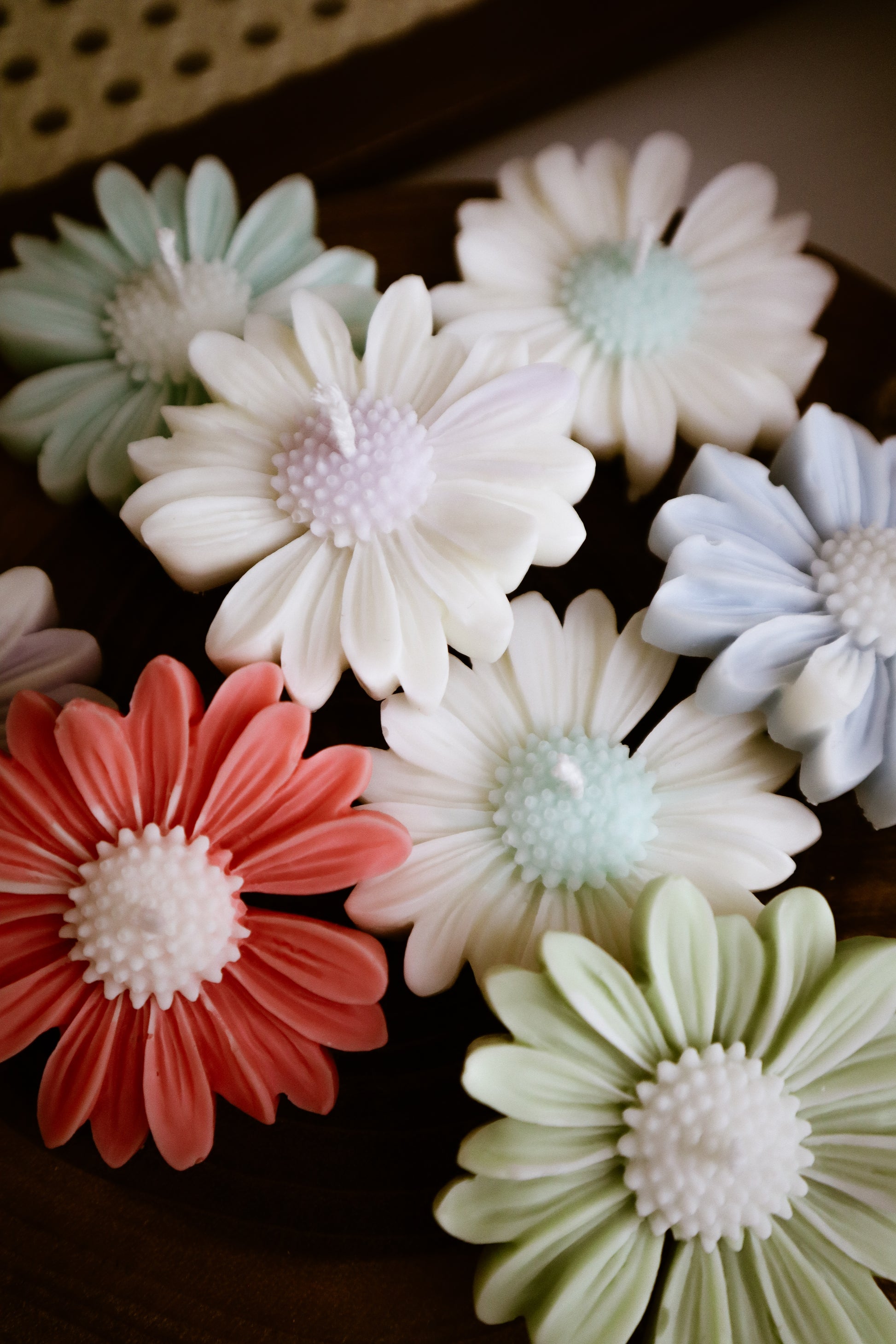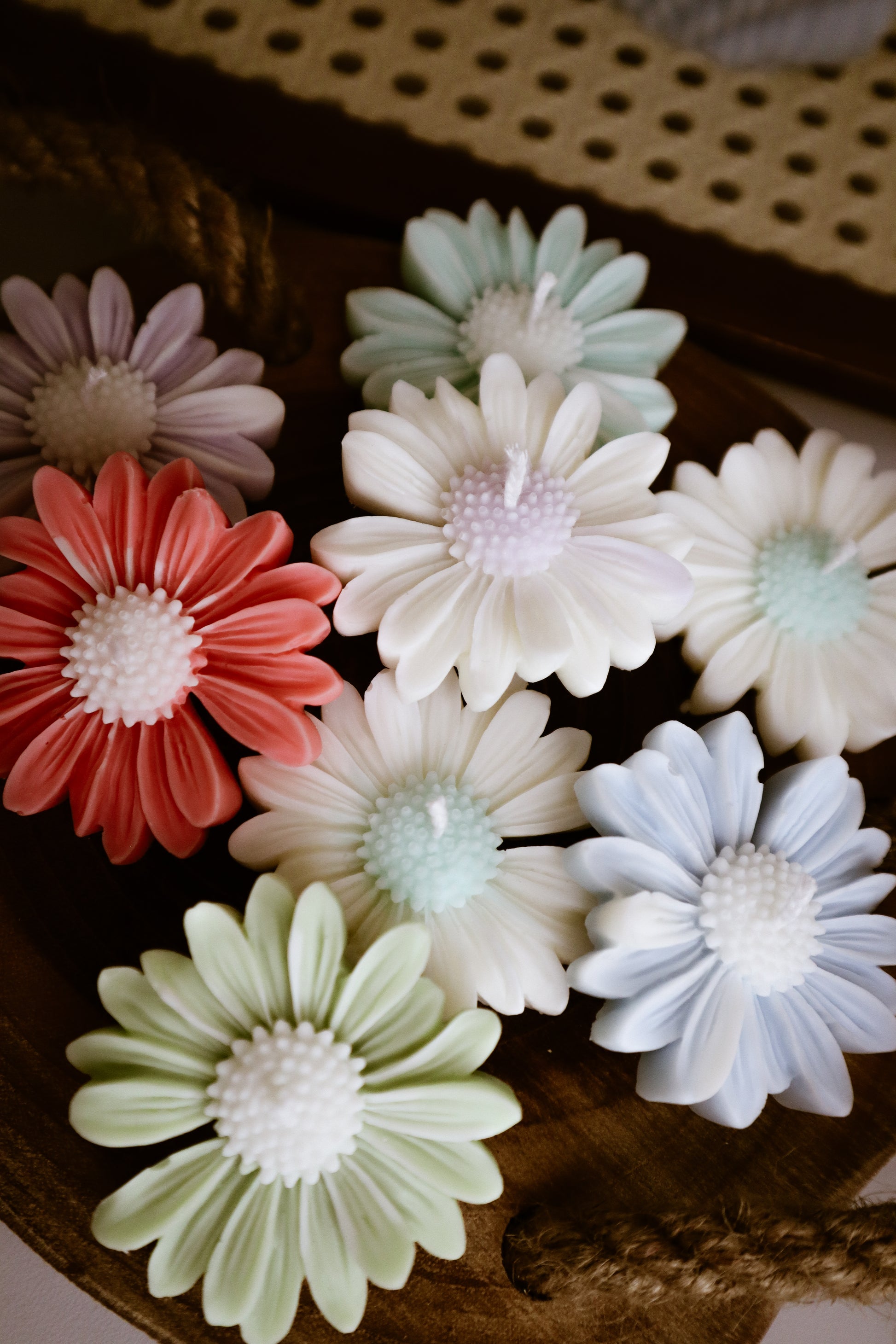 Deze madeliefkaarsjes zijn verkrijgbaar met een wit bloemhart en gekleurde blaadjes of met een gekleurd bloemhart en witte blaadjes.
